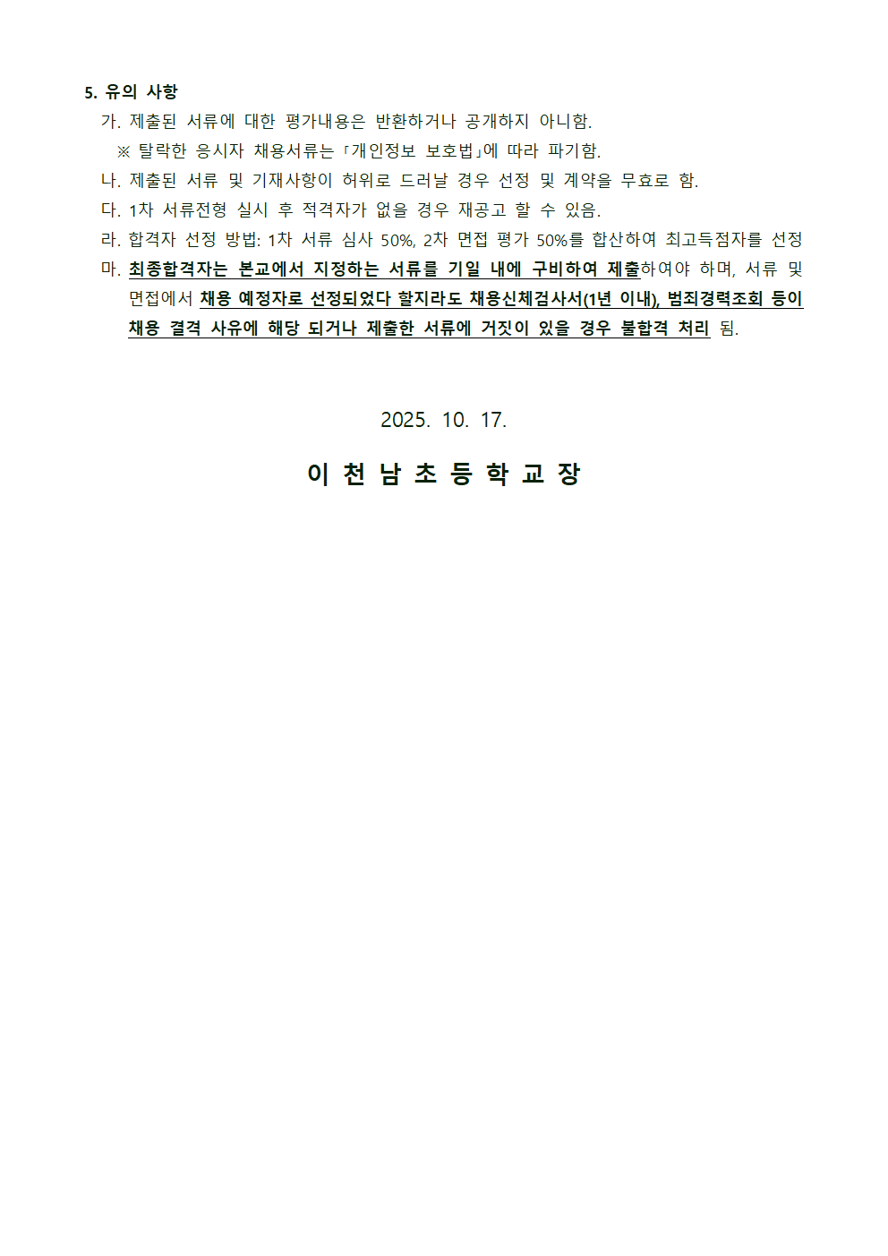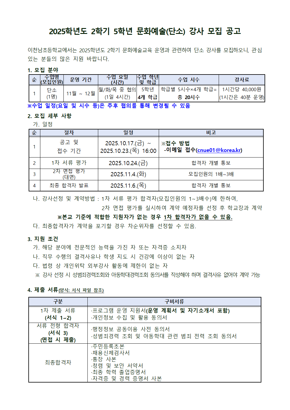 2025학년도 2학기 5학년 문화예술(단소) 강사 모집 공고