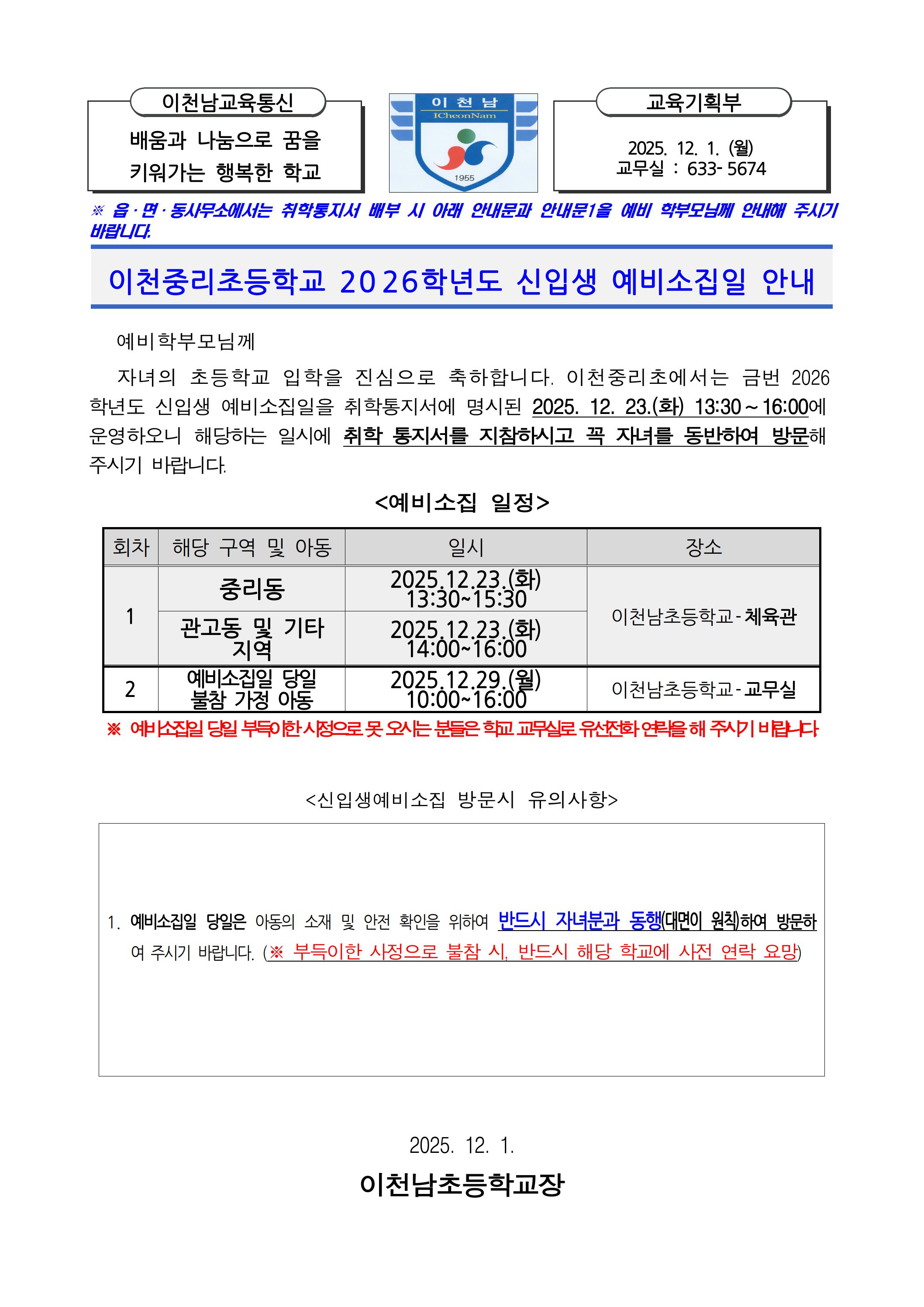 : 이천남초등학교 2026학년도 신입생 예비소집일 안내